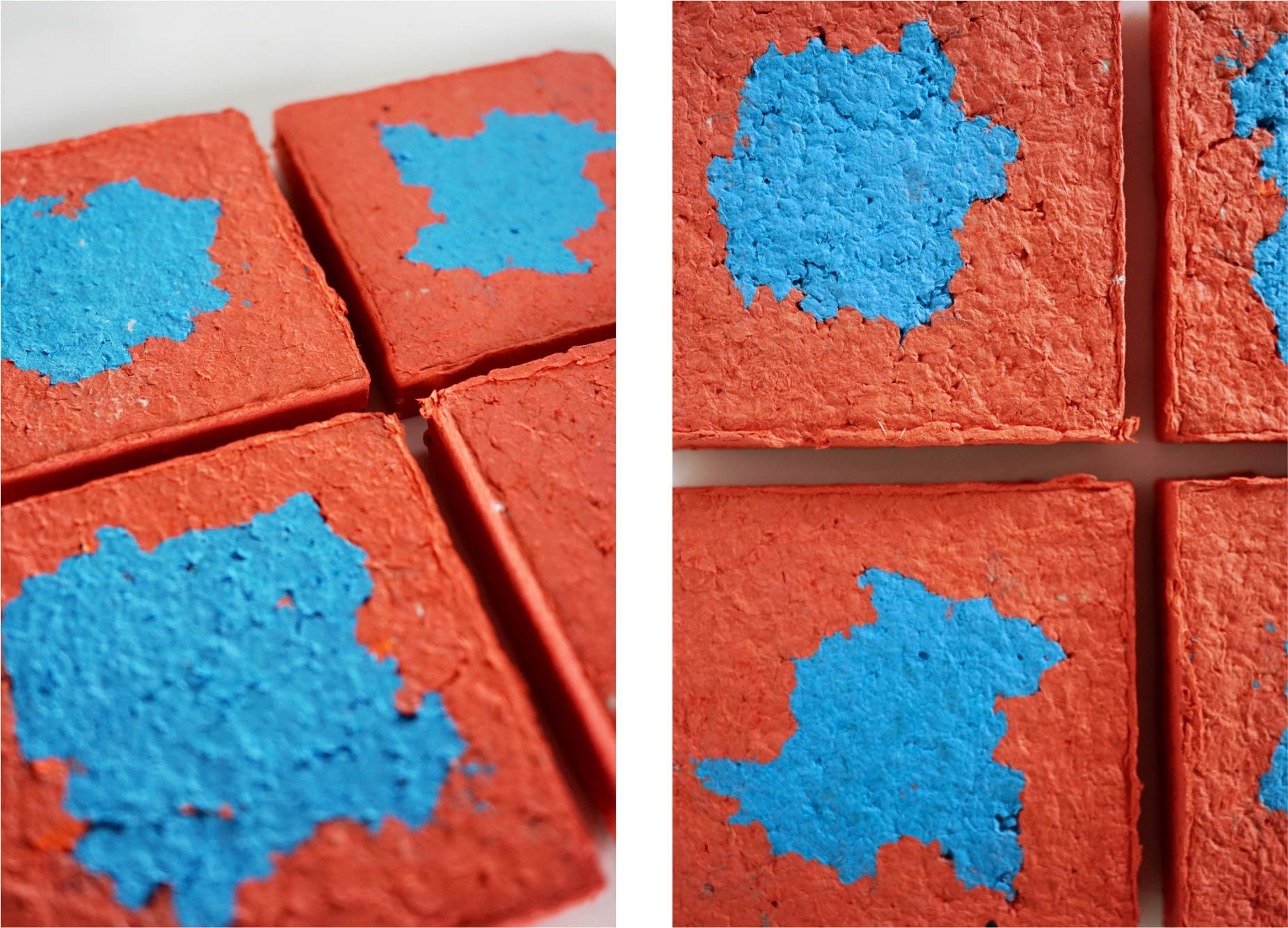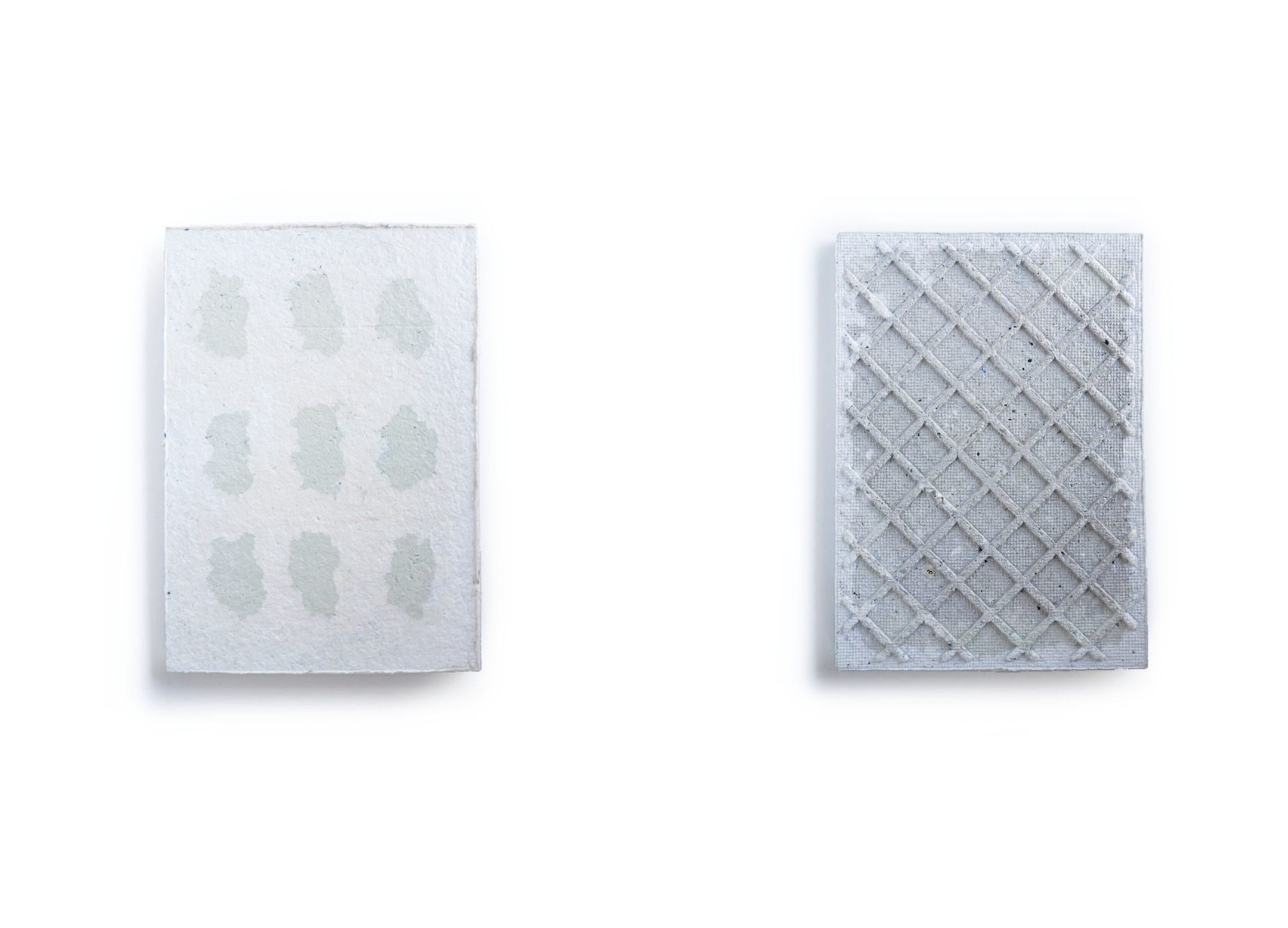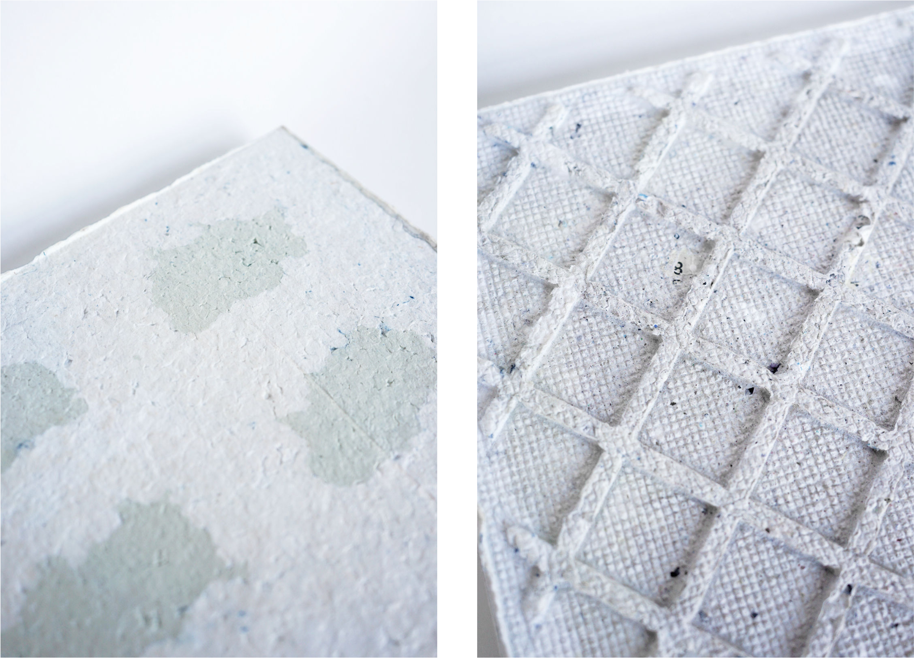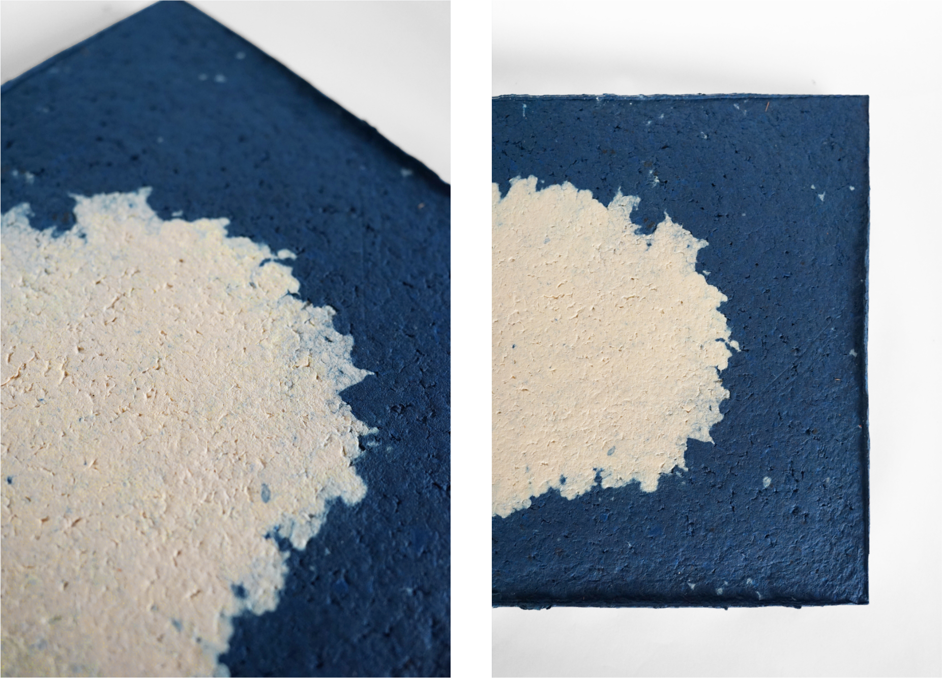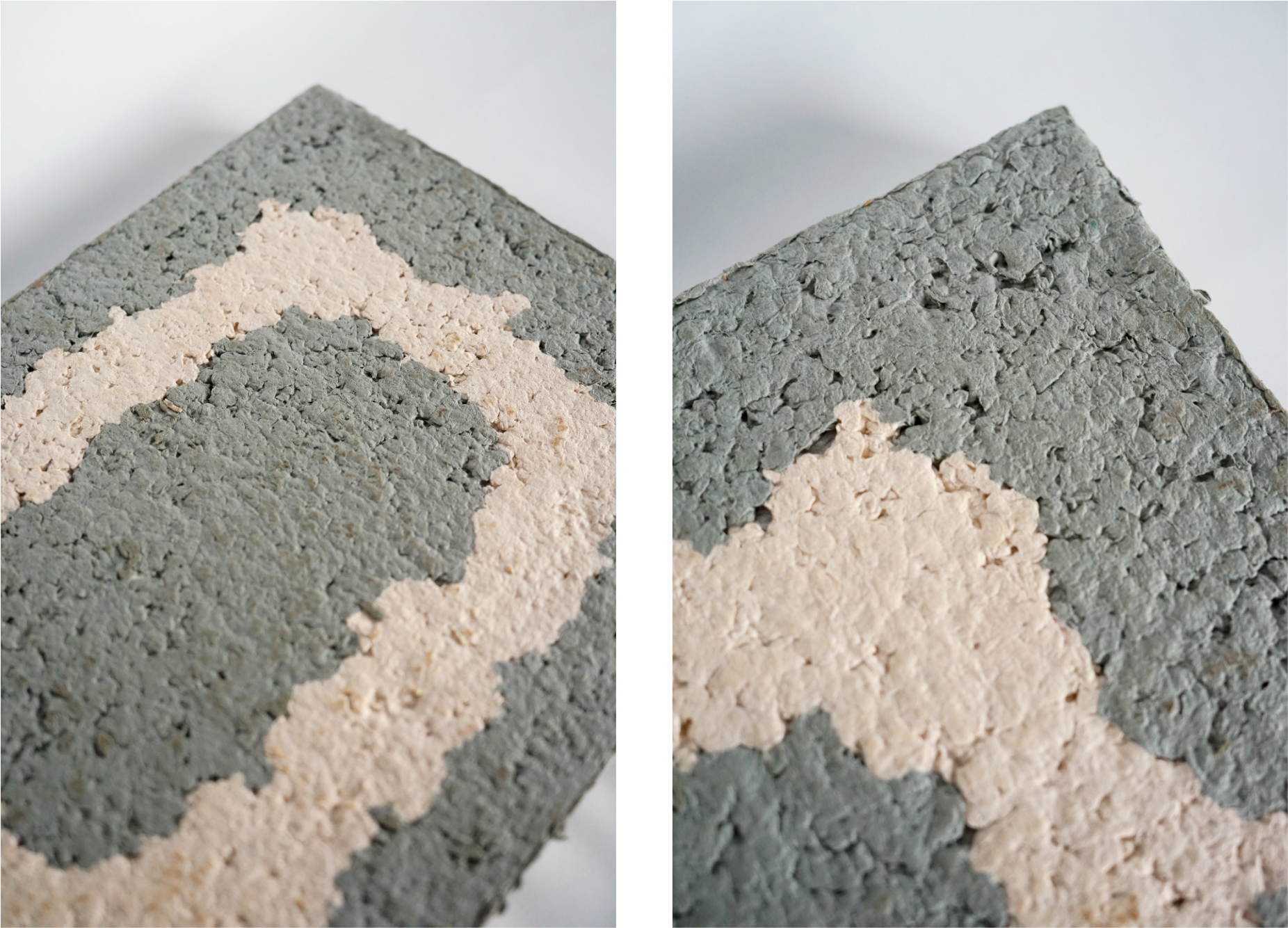 紙を生成する過程でその密度や強度を出すため細かくする繊維を、あえて粗いままにし、その粗い繊維がダマになる性質を活かしたテクスチャーを模索。色の違いや模様をつけることで、よりダマらしさを強調した。