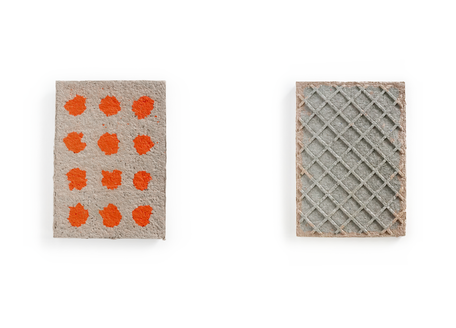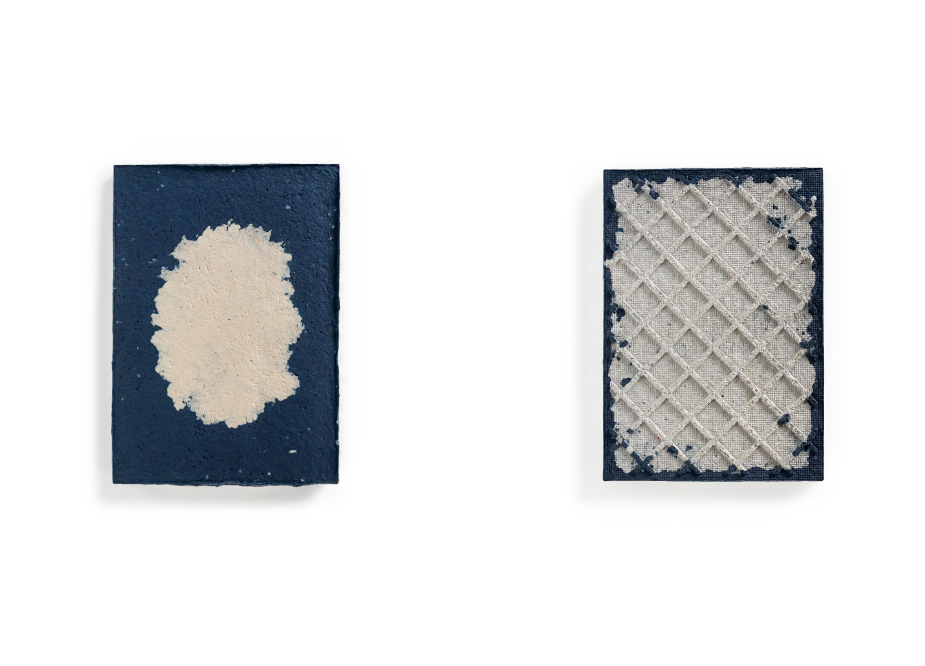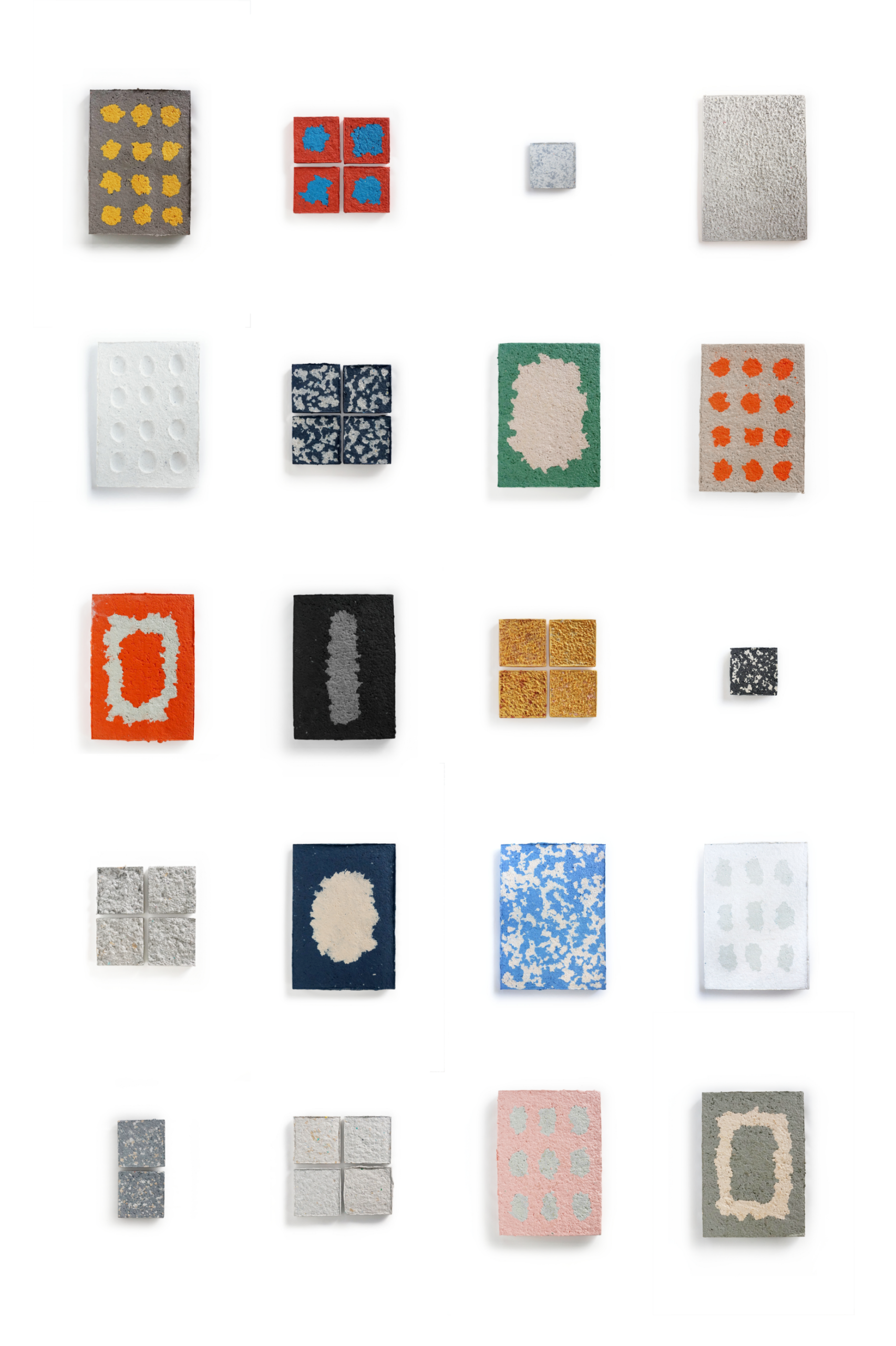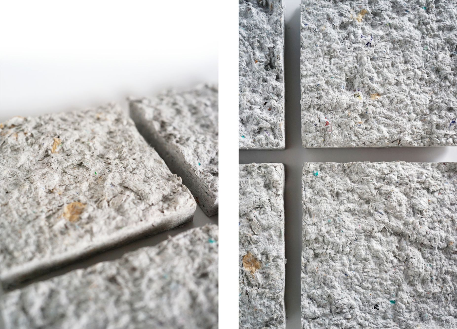 紙を生成する過程でその密度や強度を出すため細かくする繊維を、あえて粗いままにし、その粗い繊維がダマになる性質を活かしたテクスチャーを模索。色の違いや模様をつけることで、よりダマらしさを強調した。