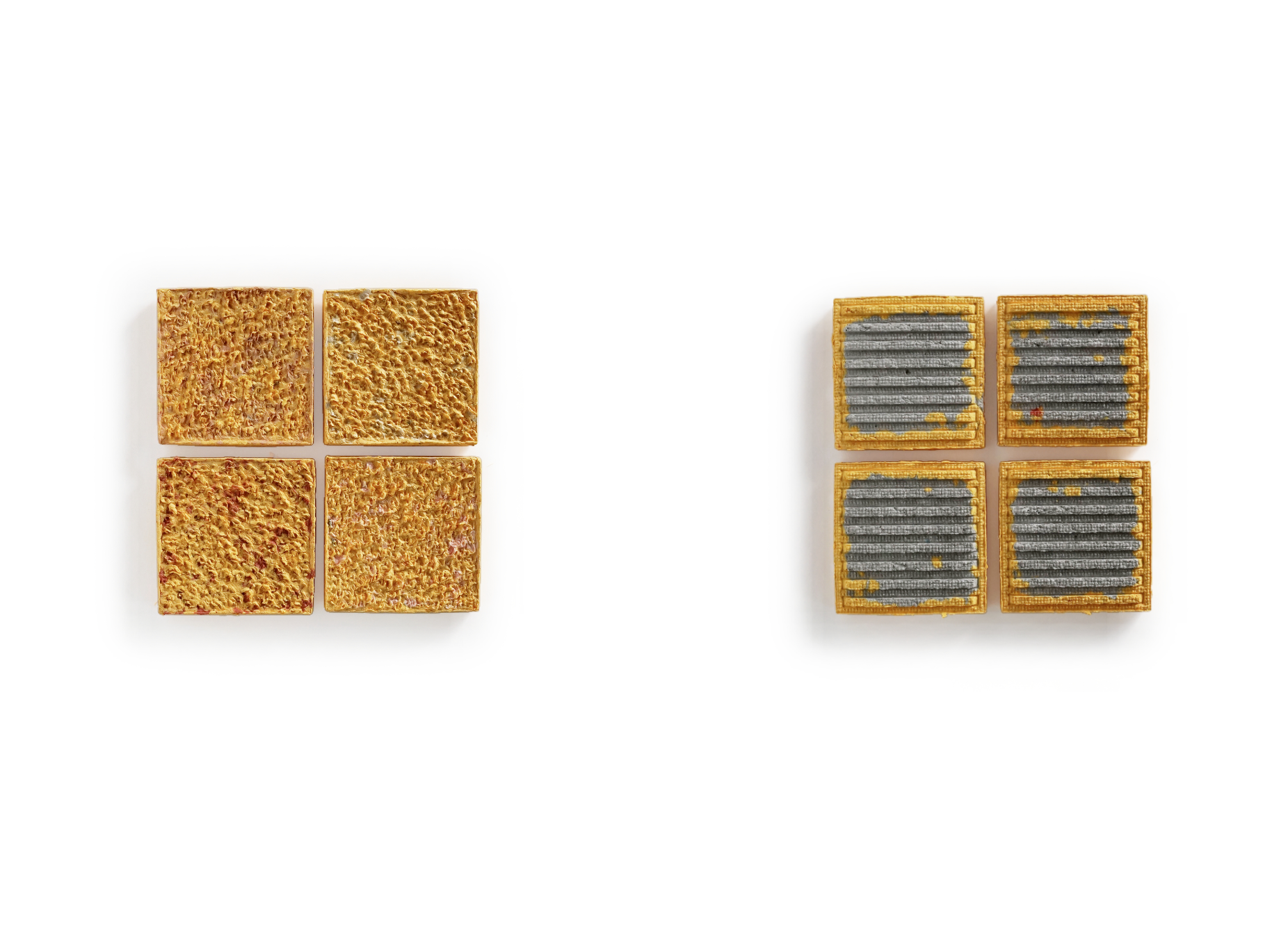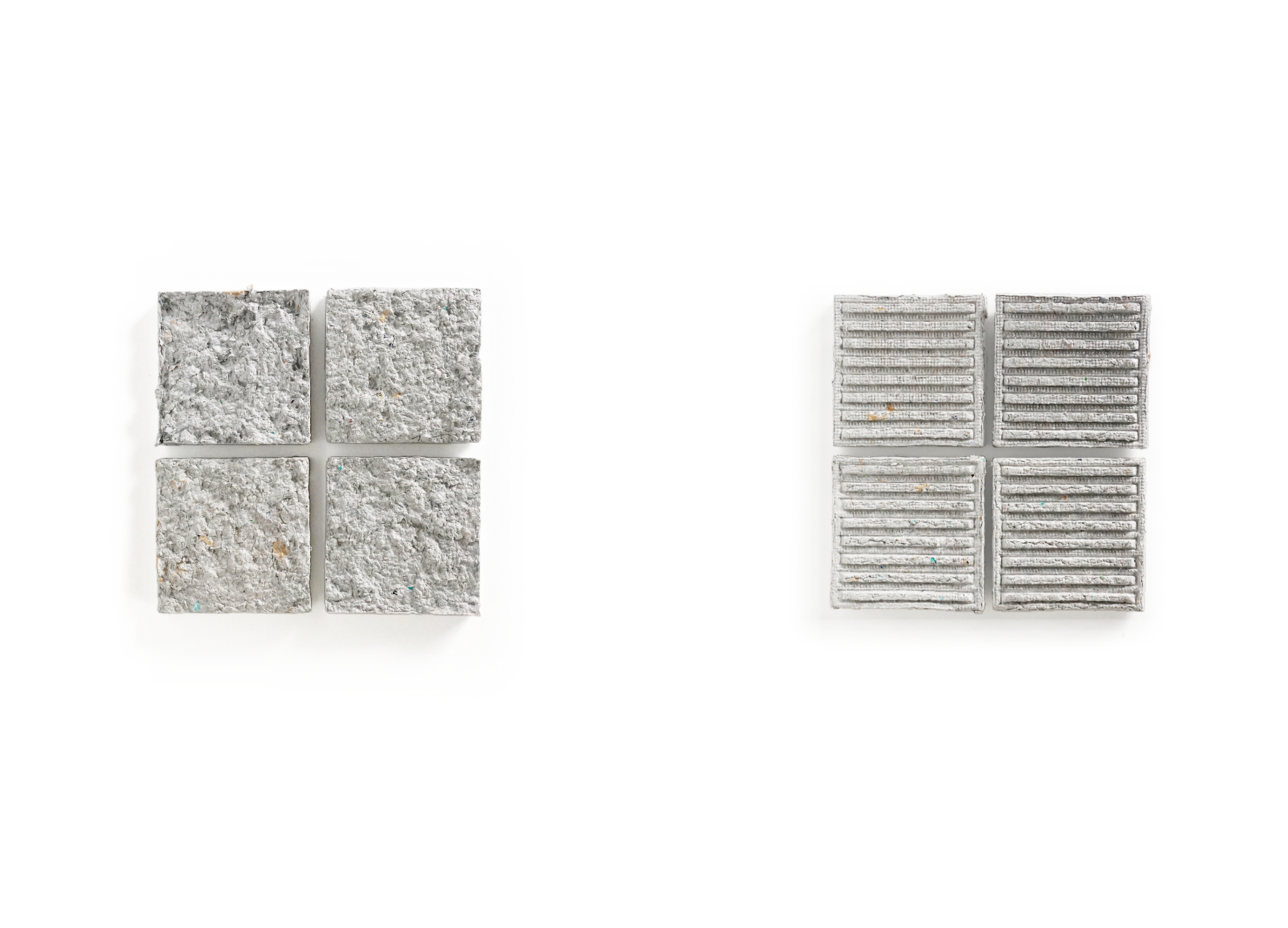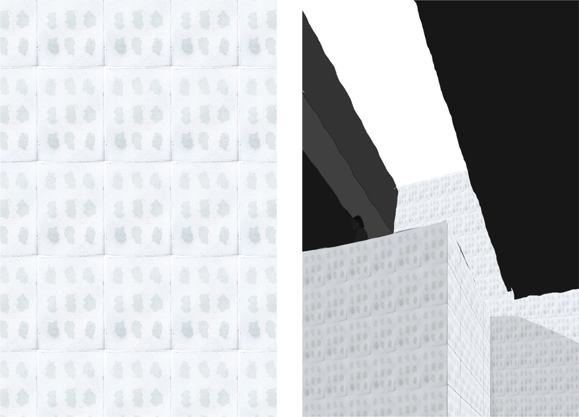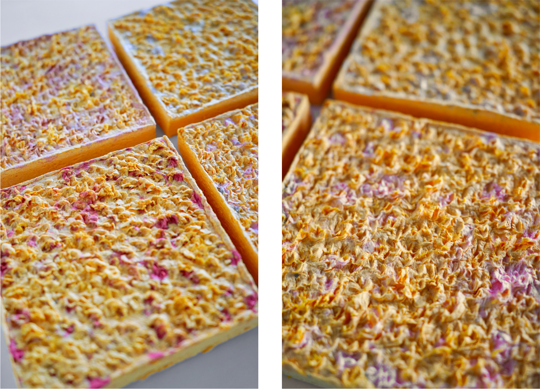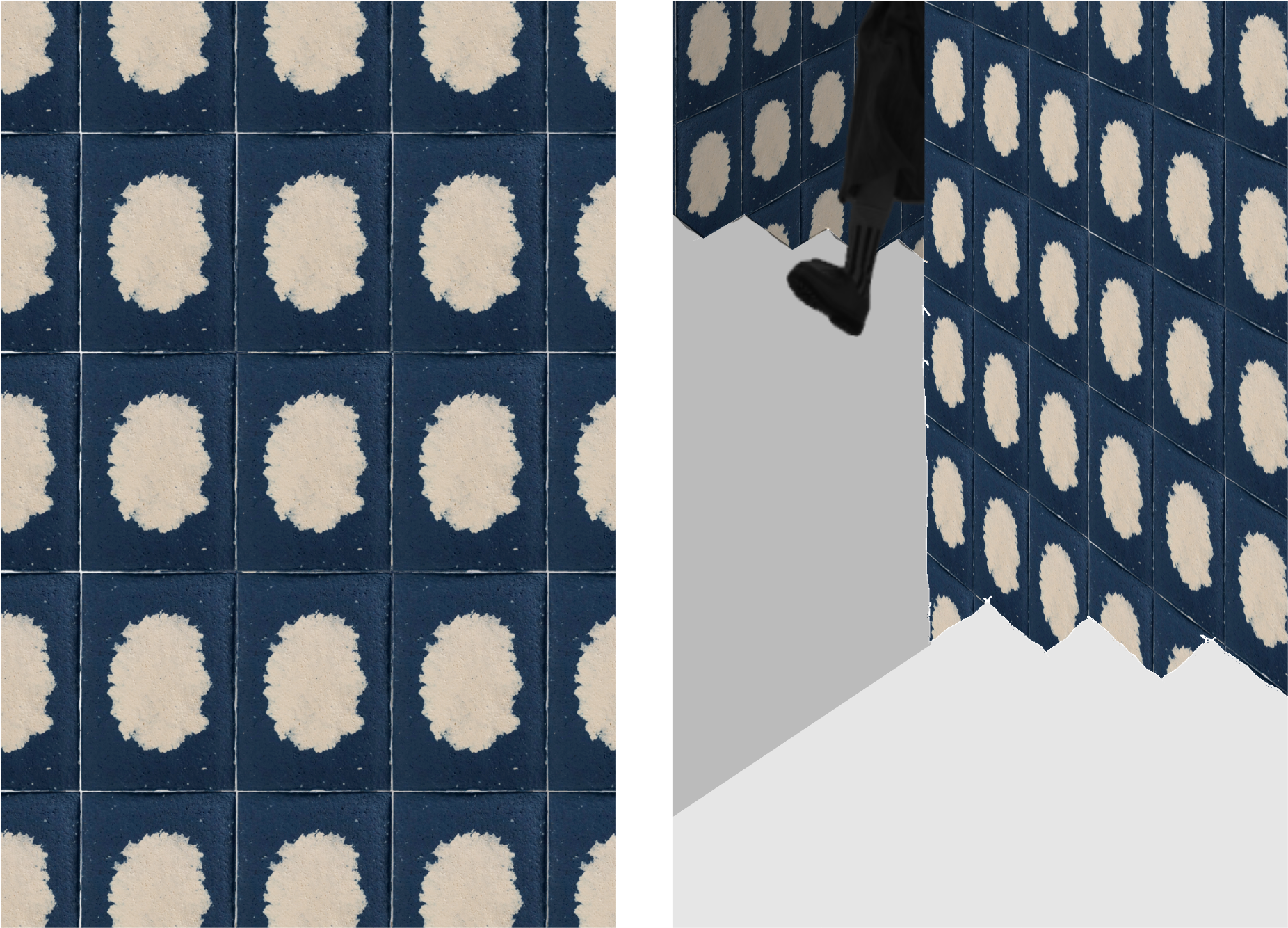 紙を生成する過程でその密度や強度を出すため細かくする繊維を、あえて粗いままにし、その粗い繊維がダマになる性質を活かしたテクスチャーを模索。色の違いや模様をつけることで、よりダマらしさを強調した。