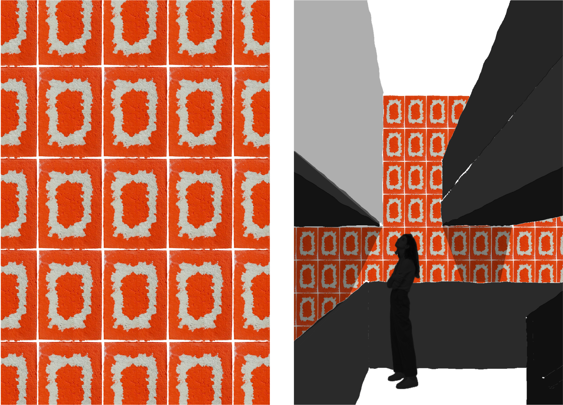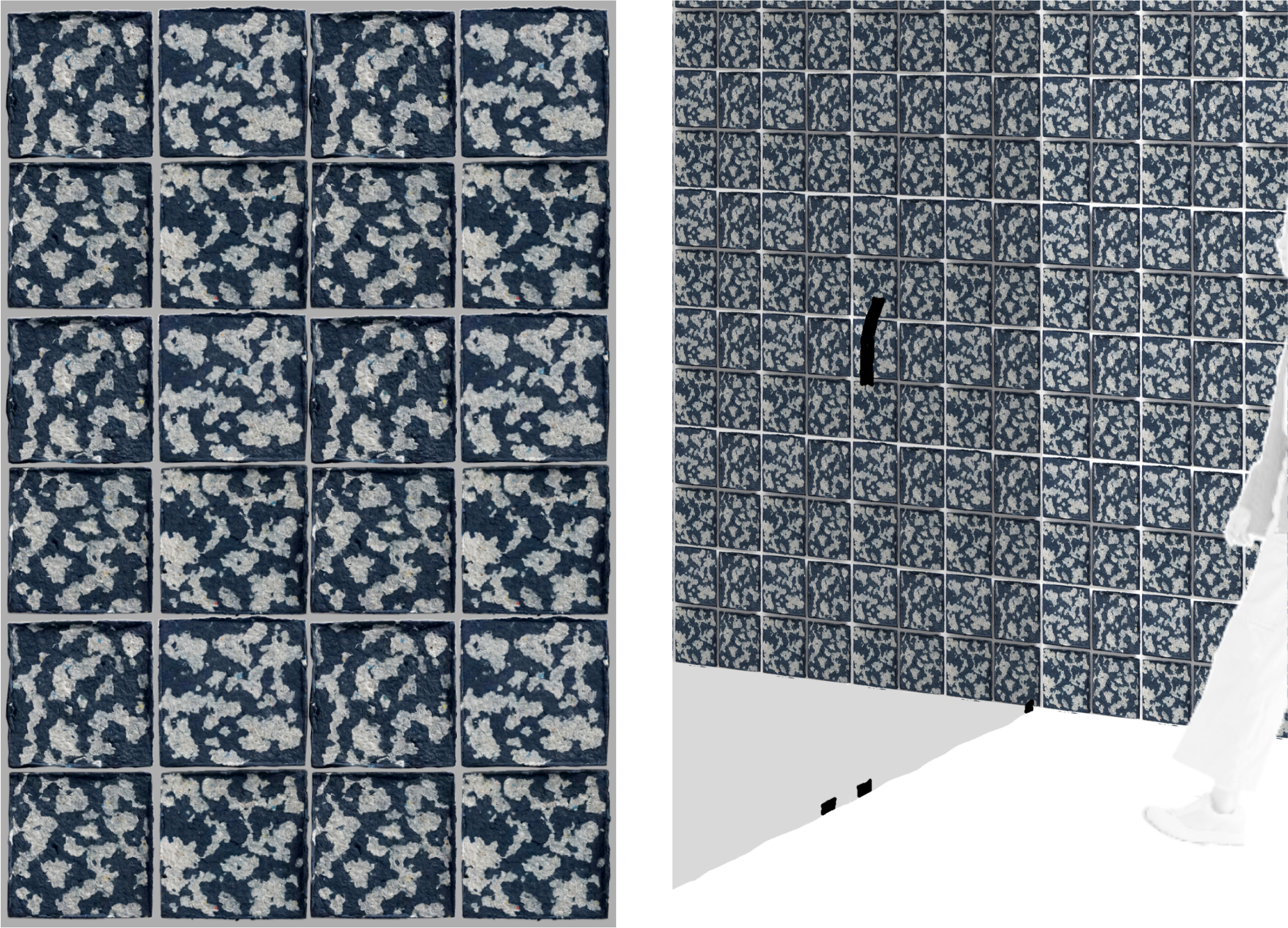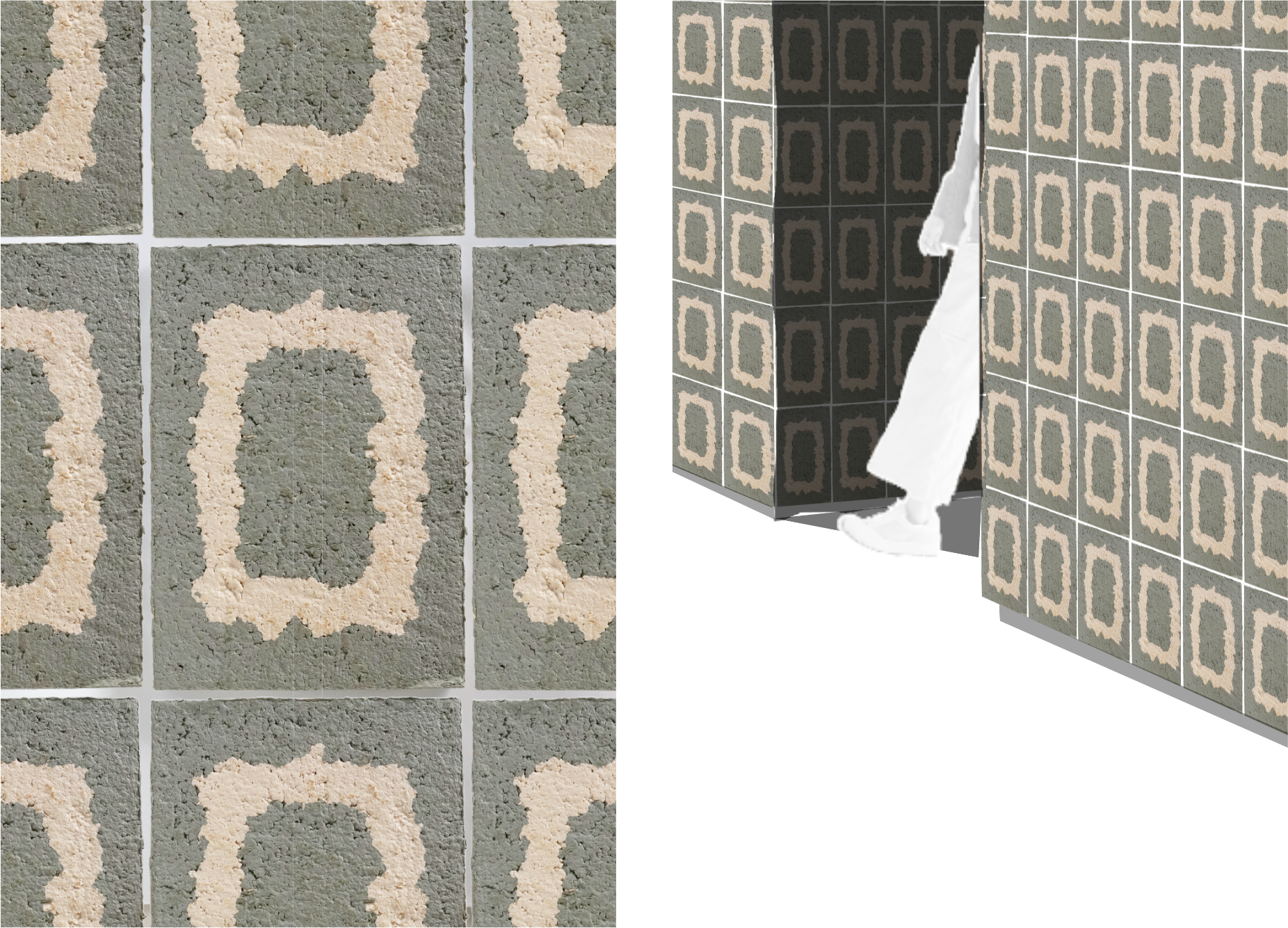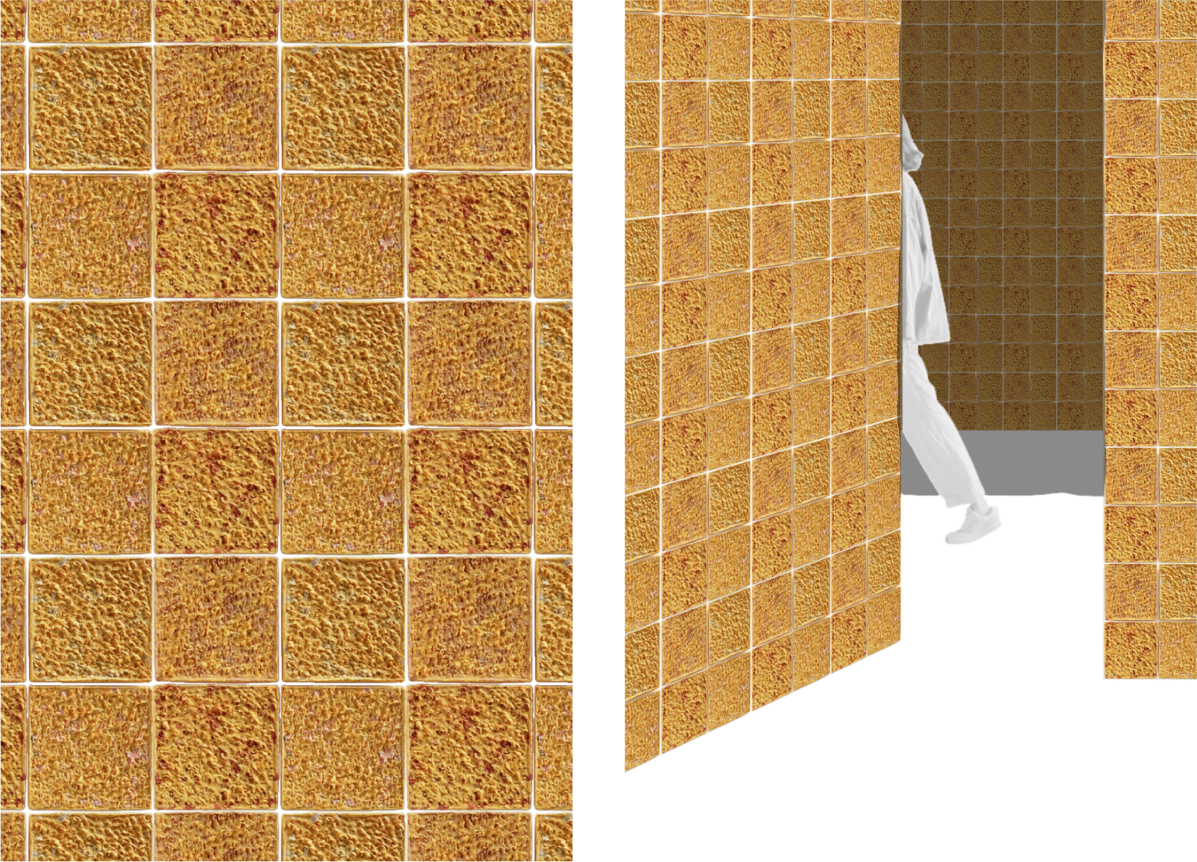 耐久性、施工性、経済性、安全性など、様々な条件をクリアしなければならない仕上げ建材。それらの条件を一旦横に置き、「間に合わせ(=仮定の物でその役に立てる/ その空間に合わせる)」をキーワードに、新しい仕上げ表現を探求する試み。